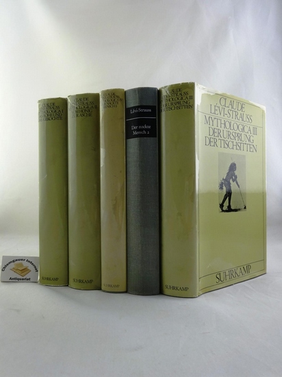 Mythologica I , II, III, IV /1 und IV/ 2. FÜNF Bände. ( so vollständig ) Aus dem Französischen von Eva Moldenhauer. Deutsche ERSTAUSGABE. Frankfurt Suhrkamp Verlag, 1971. 492,556,601, 884 Seiten. Originalleinen mit Original-Schutzumschlag. Der Band IV /2 OHNE Umschlag. Die Laminierung an den Rändern teils etwas gelöst, die Umschläge an der oberen Kante teils liecht bestoßen. Sonst sehr gutes Exemplar der Gesamtausgabe der ORIGINALAUSGABE in der deutschen ERSTAUSGABE in FÜNF Bänden. ( Wir bieten zahlreiche Titel aus diesem Sachgebiet auf unserer HP an - We offer a lot of books in this field ) --- Aus der Bibliothek der Schriftstellerin und Malerin ANITA ALBUS (!!) Auf der Titelseite des 4. Bandes mit schönes WIDMUNG und kryptischer Unterschrift von ?? ( FOTO auf Anfrage) " Pour Anita Albus, en lui posant und de ces petites enigmes qu'elle cache dans ses tableaux " - Aus ihrer Biliothek. - Mit sehr ausführlicher BIBLIOGRAPHIE. Enthält : Band 1: Das Rohe und das Gekochte. (EA, 1971) Band 2: Vom Honig zur Asche. ( EA, 1972) Band 3: Der Ursprung der Tischsitten. ( EA, 1973) Band 4 ( EA, 1975 und Band 5: Der nackte Mensch Band 1 und Band 2. ( beide EA, 1975) BEILIEGT: REZENSION des 1. Bandes.