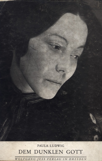 Dem dunklen Gott. Ein Jahresgedicht der Liebe. Dresden, Jess, (1932). 8°. 1 wBl. 3 Bl. Titelei, 79 S. OKt. Illustr. OUmschl., 1. 1. Ausgabe, mit dem Motto ihres dunklen Gottes Iwan Goll: 'Was wissen wir vom Streben unsrer Kniee? ... '. Die späteren 'Malayischen Liebeslieder' von Iwan Goll bilden das biografische und auch formale Pendant zu diesem Gedichtzyklus, wohl ihrem bedeutendsten Werk. - WG 4; Raabe/HB 197.3. Recht gutes Exemplar, mit dem unversehrten Umschlag selten. Dieser zeigt ihr Fotoportrait von Kurt Hildebrand Halmhuber, aufgenommen um 1930, das auch später in verschiedenen Ausschnitten abgebildet worden ist. Beiliegt Prospekt des Verlags für seine 'Junge Reihe' mit Titeln von Günter Eich, Martin Raschke u.a.- Kleine Läsuren des Umschlags sauber restauriert.