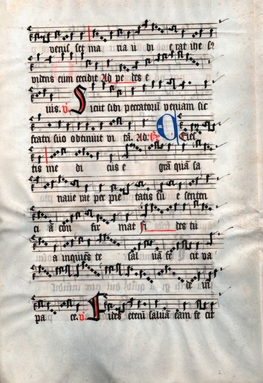 "Sicut sibi peccatorum veniam sic fratri suo obtinuit vitam". Notenhandschrift mit Text auf Pergament des 14. Jahrhunderts. _. 1 Bogen, beidseitig beschrieben. Mit je 3 schlichten farb. Zierinitialen. 44 x 31 cm, Schriftspiegel 31 x 21,5 cm. Responsorium zum Festgottesdienst zu Ehren der Hlg. Maria Magdalena (22. Juli), mit Bezügen zu Johannes 11, 32 f.. - Quadratnotation mit Rautenneumen (Einzel- u. Gruppenneumen) u. in Hufnagel-Notation sowie C- u. F-Schlüssel auf 4 schwarzen Linien, Ligaturen u. Pausenzeichen. - Vgl. Utrecht, Universiteitsbibliotheek, Ms. 406 (shelfmark 3 J 7), Cantus Siglum NL-Uu Ms. 406. - Helles, kaum fleckiges Pergament mit Längsfalz rechts im breiten Rand, dort auch kl. Schwächung der Oberfläche durch (Finger-)Feuchtigkeit; kleine Montagereste einer alten Präsentation (im Rahmen?).