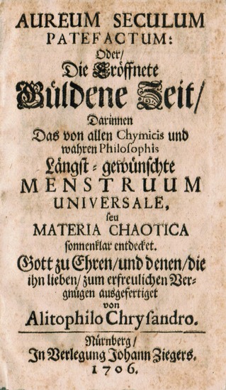 Aurum seculum patefactum: Die Eröffnete Güldene Zeit, Darinnen Das von allen Chymicis und wahren Philosophis Längst-gewünschte Menstruum universalale, seu Materia Chaotica sonnenklar entdecket. Nürnberg, Johann Ziegers, 1706. KL.-8°. 207(1) S. Überlappendes Perg. d. Zt. (minimal fleckig). Ferguson I, 155. Caillet 2359. VD 18, 11359463. Büning II, 3218. - Keine Bibliographie, auch nicht Holzmann/Boh. oder Weller können das Pseudonym des Autors auflösen. Er beschreibt in seiner Schrift die Herstellung der sog. "großen Tinctur" und zitiert teilweise ältere Autoren wie Basilius Valentinus. Im zweiten Teil bringt er seine eigenen Erfahrungen zur "wahren Philosophie" in einzelnen Kapiteln (20) zu Wasser, Luft, Magnet, Feuer, Welt-Schleim, Salz etc. ein. - Unter seinen Namen erschienen noch 2 weitere Bücher: "Deliciae medicae et chirurgicae". (4 Teile, 1704) und: "Neu eröffende Schatzkammer allerhand rarer sehr curiöser und sonderbahrer Chymischer ... Geheimnisse." (1734-36). - Verso Titel Exlibris mit gekröntem Familienwappen, vermutlich von Ferdinand August Leopold v. Lobkowitz (1655-1715), von 1699-1708 Obersthofmeister von Wilhelmine Amalie, der Frau von Kaiser Joseph I. - Nur teils im Satzspiegel minimal gebräunt. Insgesamt sehr gutes Exemplar.