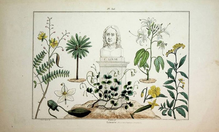 LINN?, Carl von Linn? [Linne] (1707-1778), schwedischer Naturforscher und Arzt, B?ste umgeben von Pflanzen, teils koloriert c. 1830. Copper engraving, Hand colored , Vittore Pedretti (1799-1868) after Acarie-Baron c. 18,5 x 29 cm. Antike Druckgrafik, Verso weiss, antique print, verso white.