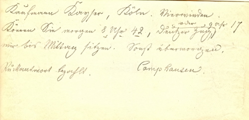 Eigenh. Schriftstück mit U. O. O. u. D. 1 S. Qu.-8vo. ?Kaufmann Kapfer, Köln. Vierwinden. Können Sie morgen 8 Uhr 42, Deutzer Zug [?] mir bis Mittag sitzen. Sonst übermorgen [?]?. ? In Bleistift.