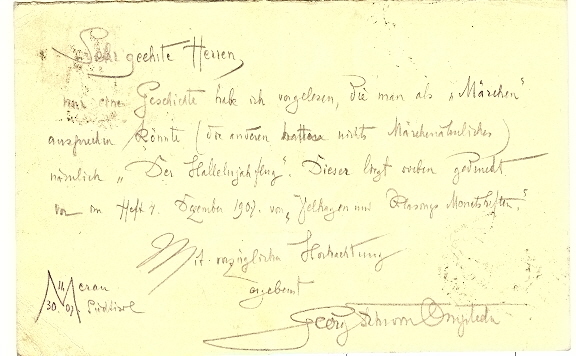 Eigenh. Postkarte mit U. Meran, 30. Juli 1907. 1 S. Qu.-8vo. Mit gestemp. Adresse. An die Amelang?sche Buch- und Kunsthandlung in Meran: ?Nur eine Geschichte habe ich vorgelesen, die man als ?Märchen? ansprechen könnte (die anderen hatten nichts Märchenähnliches)[,] nämlich ?Der Hallelujahflug?. Dieser liegt soeben gedruckt vor in Heft 4 Dezember 1907 von ?Velhagen und Klasings Monatsheften? [...]?. ? Der in Hannover geborene Sohn des letzten Hofmarschalls des englischen Königs Georgs V. war Offizier, mußte aber nach einem Unfall den Dienst quittieren und lebte fortan als freier Schriftsteller, ?übersetzte die Gesammelten Werke [...] Guy de Maupassants und schrieb zunächst in Anlehnung an Maupassant Gedichte und erotische Novellen. Größere Bekanntheit erlangte er mit seinen späteren gesellschaftskritischen Romanen, in denen er ein neues Adelsethos propagierte, so vor allem in der Trilogie ?Deutscher Adel um 1900?? (DBE). ? In Bleistift.
