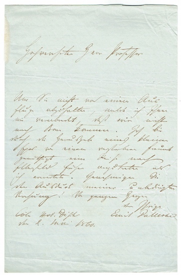 Eigenh. Brief mit Unterschrift. Cöln, 2. V. 1860. 8vo. 1 p. Blaues Papier. An einen ?Herrn Professor?, den er nicht von einem Ausflug abhalten möchte.?Ich bin durch die Herausgabe eines kleinen Epos von einem verstorbenen Freund genöthigt eine Reise nach [?] früher angetreten als ich erwartete. [?]?Emil Palleskes Nachlass befindet sich in der Berliner Staatsbibliothek (Nachlässe DDR 3, Nr. 656).