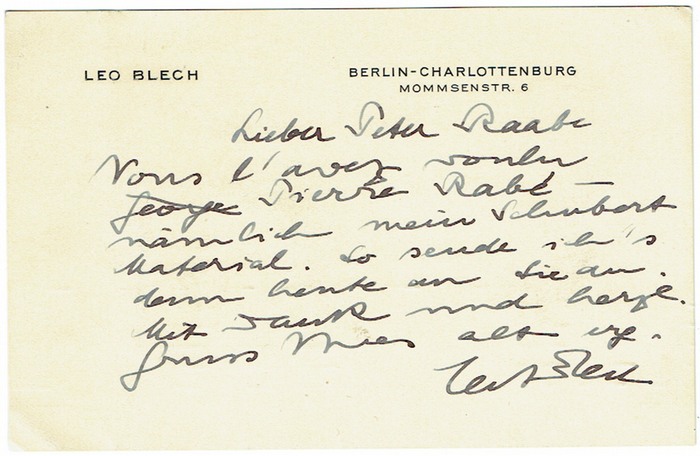 Eigenh. Briefkarte mit Unterschrift. Berlin. Quer-kl.-8vo. 1 p. Gedr. Adresse. An Peter Raabe ?Vous l?avez voulu Pierre Rabé - nämlich mein Schubert Material. So sende ich?s denn heute an Sie ab. [?]?.