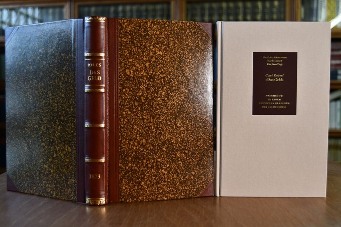 Das Geld. Darlegung der Grundlehren von dem Gelde, mit einer Vorerörterung über das Kapital und die Uebertragung der Nutzungen. Beigegeben: Vademecum zu einem deutschen Klassiker der Geldtheorie, Düsseldorf, Verlag Wirtschaft und Finanzen, 1996, 143 S., Pappband, ISBN 3878811063. "Klassiker der Nationalökonomie". Düsseldorf, Verlag Wirtschaft und Finanzen, 1996. Faksimile der 1873 in Berlin erschienenen Erstausgabe. Eines von 500 nummerierten Exemplaren. XI, 344 S. 23 x 15 cm, Halbleder mit umlaufendem Farbschnitt. Verlagsfrisch. »Knies, der einen tiefen Einfluß auf Max Weber ausübte, war einer der wichtigsten Nationalökonomen der "älteren" Historischen Schule in Deutschland«, schreibt Bertram Schefold, und Joseph A. Schumpeter urteilte: »Seine Hauptleistung liegt auf dem Gebiet des Geld- und Kreditwesens, auf dem er seine Spuren als Theoretiker zurückließ.« Carl Gustav Adolf Knies (1821 - 1898), geboren in Marburg, wurde 1855 in Freiburg zum Professor der Kameralwissenschaften ernannt. Zehn Jahre später wechselte er nach Heidelberg, wo er bis 1896 lehrte und forschte. Neben dem für die Historische Schule programmatischen Buch »Die politische Oekonomie vom Standpunkte der geschichtlichen Methode« (1853) gilt vor allem das dreibändige Werk »Geld und Credit« (1873 - 1879) als das Opus magnum von Carl Knies, dessen erster Band »Das Geld« hier als Faksimile wiederaufgelegt wird. In diesem »,klassischen Werk der deutschen Geldtheorie« (Gottfried Eisermann) untersucht Knies das Wesen des Geldes: Was ist Geld, welche Funktionen hat es? Welche Geld- oder Währungsordnungen sind anzustreben? »Knies ist in der heutigen Geldtheorie noch gegenwärtig, wenngleich ungenannt und unerkannt. Niemals vor ihm sind unseres Wissens die auch heute noch gelehrten Geldfunktionen systematischer dargestellt und begründet worden als in seinem Buch "Das Geld".«.