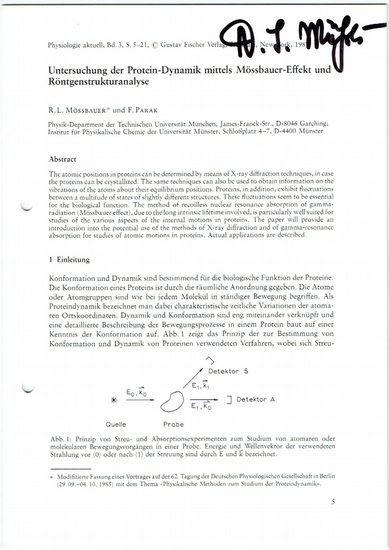 Eigenh. Unterschrift auf gedr. Brochüre. ohne Ort, 1987. 8vo. Eigenh. Unterschrift auf gedr. Brochüre ?Untersuchung der Protein-Dynamik mittels Mössbauer-Effekt und Röntgenstrukturanalyse?.