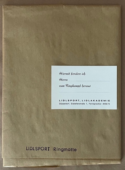 Lidlsport Ringmatte. Gefaltetes Packpapier mit Stempel "LIDLSPORT Ringmappe" und "Immendorff 69", 100 x 75 cm. Gefaltet 25 x 19 cm. Mit einer beiliegenden Karte: "Hiermit fordere ich Herrn .......zum Ringkampf heraus...... ". In transp. Kunststofftüte. Remscheid: Vice Versand. 1969. tadellos.