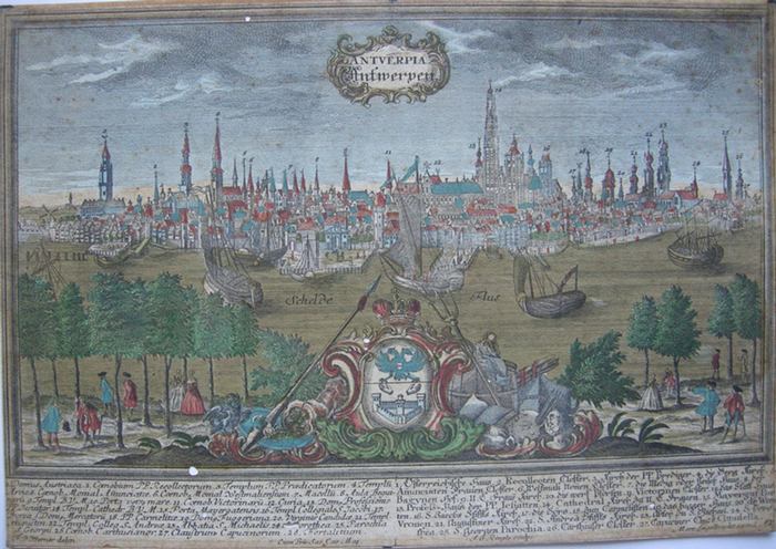 "Antwerpia Antwerpen". Gesamtansicht von Antwerpen über die Schelde hinweg. Im Vordergrund Spaziergänger in einem Wäldchen. _. Altkolorierter Kupferstich von J. G. Ringle nach einer Zeichnung von Friedrich Bernhard Werner, bei Martin Engelbrecht, Augsburg, 1748. Am unteren Rand Legenden in Deutsch und Latein. Nr. 24 der 94 Kupferstiche umfassenden Serie "Europäische Städteansichten", Marsch, S. 217. - einige Wurmlöcher, im Himmelsbereich leicht stockfleckig.