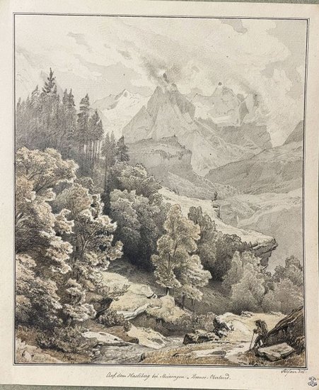 Auf dem Hasliberg bei Meiringen - Berner Oberland. Bleistift, in Braun laviert auf leichtem Karton. 1847. Unten links signiert und datier "Steffan [18]47". Von alter Hand mit dem Titel bezeichnet. 25,7 x 21,6 cm. Die bildhaft ausgeführte stimmungsvolle Landschaftszeichnung ist mit einem doppelten Tuschrand eingefasst. - Johann Gottfried Steffan war einer der bedeutendsten Schweizer Landschaftsmaler des 19. Jahrhunderts. Er gehört zu den bekannten Vertretern der Münchner Schule. Ab 1833 besuchte er die Akademie der bildenden Künste unter Peter von Cornelius in München. Unter dem Einfluss von Carl Rottmann wandte er sich der realistischen Landschaftsmalerei zu. Steffans Atelier wurde zum Mittelpunkt der Schweizer Künstler in München. In seinem Atelier arbeitete unter anderem Arnold Böcklin. Mit zahlreichen Kollegen unternahm er Studienreisen in die Schweizer Alpen. Ab den 1840er Jahren besuchte er vermehrt Berchtesgaden wo er viele seiner Motive fand. - Provenienz: Karl Ewald Hasse (1810-1902), Göttingen (Lugt 860), recto mit dem Sammlerstempel. - Sehr guter Zustand.