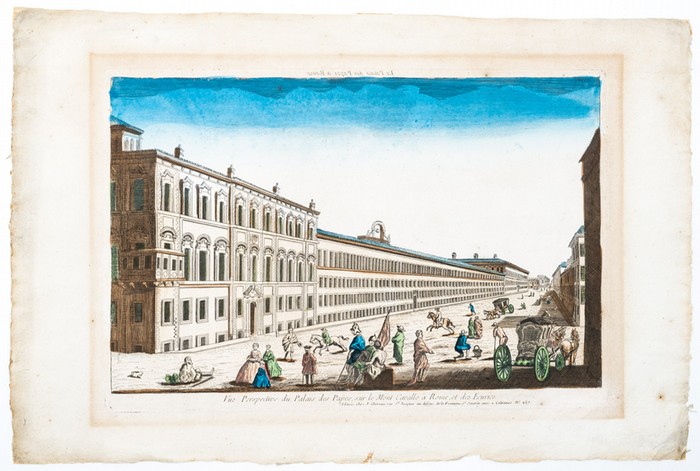 Vue Perspective du Palais des Papies, sur le Mont Cavallo à Rome, et des Ecuries. - Paris:, Chereau, [um 1780]. Altkolorierter Kupferstich 25 x 39 cm, Blattgröße 35 x 53,5 cm. Guckkastenblatt. Der Kupferstich zeigt in der linken Bildhälfte den Palast Papies, daneben einen Blick in die Tiefe der angrenzenden Straße. Im Vordergrund lebhafte Personenstaffage. Über dem Bild in spiegelverkehrter Schrift der gekürzte Titel. Unter dem Bild mittig der Titel und die Verlagsangabe.- Jacques Chereau, 1688 - 1776, Kupferstecher und Verleger u.a. von Guckkastenblättern. - Das Papier staubrandig und im Bereich des ehemaligen Passepartoutausschnittes gebräunt Das Altkolorit teilweise grob. Das Motiv mit seiner Zentralperspektive in feiner Tiefenwirkung.