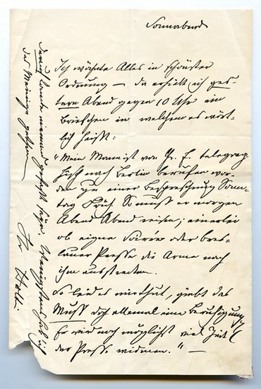 An den Schriftsteller Max Kurnik (1819-1881): "Ich wähnte Alles in schönster Ordnung - da erhielt ich gestern Abend gegen 10 Uhr ein Briefchen in welchem es wörtlich heißt: 'Mein Mann ist [...] telegraphisch nach Berlin berufen worden zu einer Besprechung Sonntag Früh. So muß er morgend Abend [...] reisen; einerlei ob eigne Soirée oder Breslauer Presse die Arme nach ihm ausstrecken [...]'". - Max Kurnik zählte seit den 1850er Jahren zu den führenden linksliberalen Journalisten in Breslau, begründete 1851 das erste Telegraphenbüro Schlesiens und war als Theaterkritiker der "Schlesischen Zeitung" und später der "Breslauer Zeitung" tätig. - Mit einem kleinen Ausriß durch Siegelbruch am unteren Rand (keine Buchstabenberührung) und mit stärkeren Faltspuren.