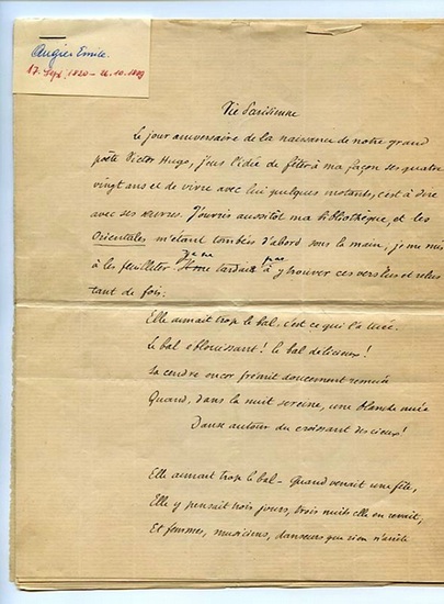 "Vie Parisienne". Eigenh. Manuskript. O. O. u. D., [1882]. 11? SS. auf 12 Bll. 4to. Manuskript einer Abhandlung über das Leben in Paris, speziell über die Kultur- und Entwicklungsgeschichte der Bälle. - Anläßlich des achtzigsten Geburtstags von Victor Hugo habe er beschlossen, diesen Tag zu Ehren des Dichters auf seine Weise zu feiern, indem er nämlich ein wenig Zeit mit ihm, d. h. mit seinen Werken verbringen wolle. Dabei sei er in seiner Bibliothek zunächst auf die Gedichtsammlung "Les Orientales" gestoßen, in der er auch sogleich die schon so oft gelesenen Verse über ein Mädchen, das die Bälle so sehr liebte und auf einem solchen verstarb, wiederfand und las: "Elle aimait trop le bal, c'est ce qui l'a tuée | Le bal éblouissant ! le bal délicieux! | Sa cendre encor frémit doucement remuée | Quand, dans la nuit sereine, une blanche nuée | Danse autour du croissant des cieux". - Zunächst habe er geglaubt, Hugo lasse hier seinem Haß auf Bälle freien Lauf, bis eine weitere Strophe ihn eine Besseren belehrte, in der er die Sinnesfreuden eines Balls anpreist: "Quel bonheur de bondir, eperdue, en la foule | De sentir dans le bal ses sens multipliés, | Et de ne pas savoir si dans la nue on roule | Si l'on chasse en fuyant la terre ou si l'on foule | Un flot tournoyant à ses pieds". - Der Dichter singe hier ein Loblied auf das Tanzen. Auch in den alten Chroniken sei beschrieben, daß auf Bällen von jeher getanzt wurde, zunächst im Freien, und später, als der Ball seinem ländlichen Ambiente entzogen wurde, zunehmend in immer prunkvolleren Sälen. Charles VI habe bei einem Ball aufgrund einer heruntergefallenen Fackel beinahe sein Leben verloren wie vier seiner Begleiter, die den Flammen nicht mehr entkommen konnten. Weiters über Ballveranstaltungen unter François I sowie Henri II, III und IV. - Die letzten Bll. mit kleineren Randläsuren, Bl. 12 im Mittelfalz etwas eingerissen und alt hinterlegt. - Die Verso-Seite von Bl. 12 mit einem kl. Registraturetikett und der hs. Numerierung "18".