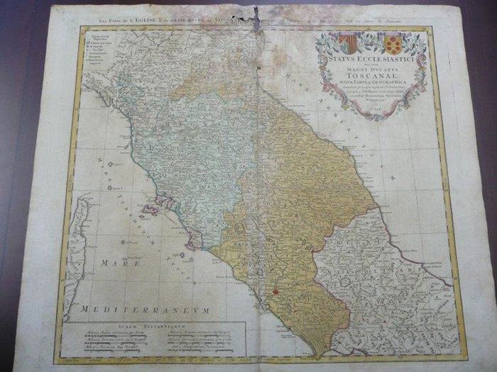 Les Etats de L' Eglise & du Grand Duche de Toscane von zwei Platten gedruckt, Orig. Kolorierter Kupferstich mit allegorisch-Heraldischer Darstellung in der rechten oberen Ecke, 1748. 62,5 cm x 54,5 cm, (etwas Schimmelfleckig/ Fehlstelle an oberer Leiste hinterlegt)---.