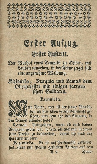 Thakmene und Kizimirka. Oder die geprüfte und obsiegende Heldenliebe. Ein Lustspiel in drei Aufzügen. Wien, Krauß, 1760). 16°. Ohne Titel, S. 4-100. Alte Interimsbroschur., Heubel, Thakmene und Kizimirka. Sehr seltene 1. Ausgabe.
