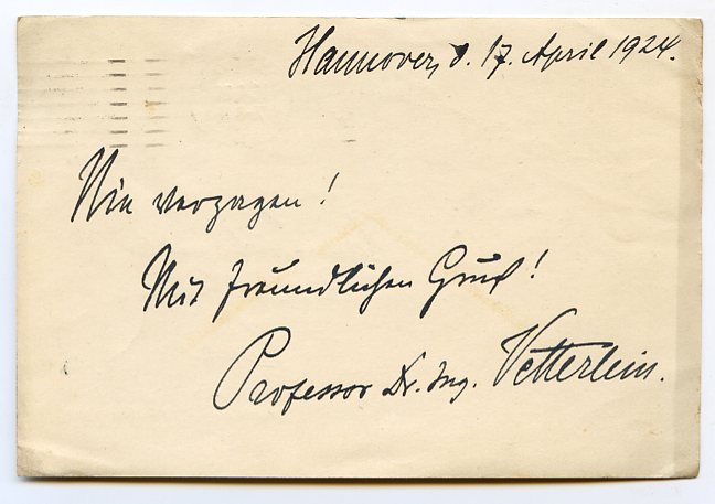 Eigenh. Albumblatt mit U. Hannover, 17. April 1924. 1 S. Qu.-8vo. Auf einer Postkarte mit eh. Adresse. An den Buchhändler Robert Steurer in Linz, der ihn wohl um ein Autograph gebeten hatte: ?Nie verzagen! | Mit freundlichem Gruße! Prof. Dr. Ing. Vetterlein?. ? Seit 1905 Professor in Darmstadt, folgte Ernst Vetterlein 1919 einem Ruf als Ordinarius für Städtebau, Siedlungswesen und Kleinwohnungsbau an die TH Hannover und lehrte dort später auch Ästhetik der Baukunst, Landesplanung und Gebäudekunde. ?Seit 1927 war Vetterlein ordentliches Mitglied der Freien Deutschen Akademie des Städtebaus in Berlin. Er erbaute u. a. die Kölner Handelshochschule, das Stadttheater in Hagen sowie Kirchen in Straßburg und Hannover? (DBE). ? Mit kleinen Gebrauchsspuren.
