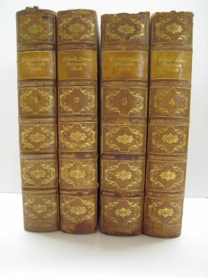 Sämtliche Werke nebst Tagebüchern und einer Auswahl der Briefe. Hrsg. von P. Bornstein. Bd. 1-4 [von 6]. München, Georg Müller [ 1911-14]. Gr.8°. Mit Tafn. u. Faksimiles. Hellbrauner Lederband der Zeit mit reicher Rückenvergoldung, Deckelfileten, Stehkanten- u. Innenkantenvergoldung und Kopfgschn. Säkularausgabe. Staatsbibl. Sign. Yc 9920/43-1. Die Bände 5 und 6 erschienen erst 1926. Ex. 129/150 der Luxusausgabe auf holländisch Bütten. - Schnittkanten gebräunt. Gelenke tls. gelockert. Exlibris. Bd. 3/4: Kanten und Kapitale beschabt.