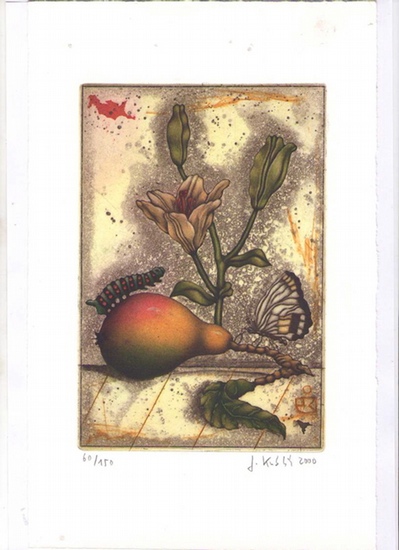 Jochen Kublik. Farbradierungen. [Mit einer original Farbradierung signiert. Kunsthaus Lübeck]. Bramsche, Rasch, 2000. Pappband, gr-8°, querformat, 64 S., durchgehend farbig illustriert, 1 original Radierung als Beilage; -Radierung mit kleinem Fleck, sonst tadelloses, sehr gutes Exemplar. Beiliegend eine signierte und numerierte Farbradierung [*päron och liljor*]. isbn 3934005926.