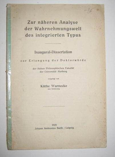 Zur näheren Analyse der Wahrnehmungswelt des integrierten Typus. Inaugural-Dissertation zur Erlangung der Doktorwürde der Hohen Philosophischen Fakultät der Universität Marburg. Vorgelegt von Käthe Warnecke aus Schleswig. Leipzig; Johann Ambrosius Barth, 1928. 48 S. Mit wenigen graph. Darstellungen. Gr.-8°(=22,5-25cm), Softcover/Paperback (Fadenheftung). Dissertationsschrift mit Fadenheftung, mit einfachem Papiereinband, dieser mit kleineren Kanten- und Randläsuren sowie geringen Bestößen, gering stockfleckig. Papier qualitätsbedingt nachgedunkelt. Ordentliches Exemplar.