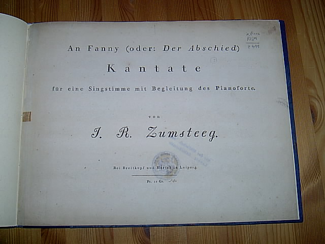 An Fanny (oder: Der Abschied). Kantate für eine Singstimme mit Begleitung des Pianoforte von J. R. Zumsteeg. (Pr. 12 Gr.). Leipzig, Breitkopf & Härtel (1803). Titelblatt, 12 S., Qu.-Folio, sauber und fachmännisch neu eingebunden in Bibliotheks-Halb-Leinen mit marmorierten Deckeln,. ehemaliges Bibliotheksexemplar mit Deckel-Signaturschild und Stempeln ("ausgeschieden"), Ecken teils fleckig und mit kleinen, fachmännisch hinterlegten Läsuren (kein Text- oder Notenverlust), ansonsten gut erhaltenes Exemplar,.