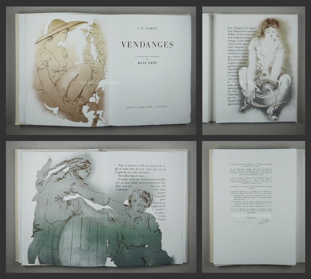 Vendanges. 42 lithographies originales de Hans Erni. Lausanne., André et Pierre Gonin., 1981. 40,8x30,5 cm. 102 p., 3 f. En feuilles sous chemise illustrée et chemise demi parchemin, emboîtage. No. 57/132 exemplaires numérotés sur vélin anglais. Signé par Erni et Gonin (tirage: 165 expl. + 40 expl. h.c.). - Bel exemplaire.