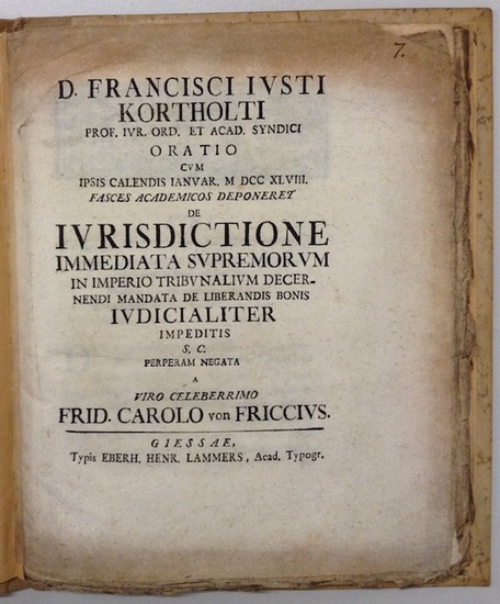Oratio de iurisdictione immediata supremorum in Imperio tribunalium decernendi mandata de liberandis bonis iudicialiter impeditis s. c. perperam negata a F. C. von Friccius. Gießen, Lammers, 1748. 4to. 56 S. Späteres Halbleinen. Ab Seite 45 abgedruckt ein kaiserliches Mandat datiert 6. August 1747 in Sachen des Rechtsstreits zwischen den Universitäten Gießen u. Marburg in Sachen der Ablösung von auf Kasseler Gebiet liegenden Universitätsvogteien u. Gefällen; die Universität Marburg solle auf ihre Ansprüche verzichten. - Unbeschnitten. Leicht stockfleckig, Schnitt verstaubt, wenige Bleistiftanstreichungen. Titel in den Rändern gebräunt.
