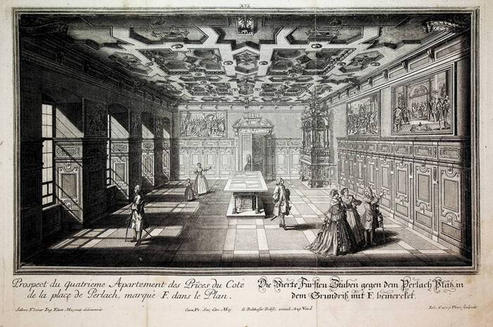 AUGSBURG, Rathaus: 4. F?rstenstube Titel: Die Vierte F?rsten Stuben gegen dem Perlach Platz, in dem Grundri? mit F bemercket. Aus: Das Pr?chtige Rath Hau? der Stadt Augspurg Salomon Kleiner Augusburg, Verlag Jeremias Wolff Erben d.i. Georg Baltasar Probst, 1733. original Kupferstich, Johann Georg Pintz nach Salomon Kleiner, Blatt: 32,5 x 48,5 cm, Platte: 26 x 40 cm, deutscher und franz?sischer Titel, Blatt mit 2 Faltkanten.