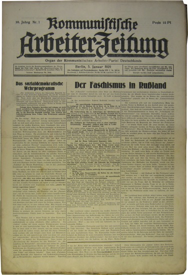 Organ der Kommunistischen Arbeiter-Partei Deutschlands. 10. Jahrgang, 1929, Nr. 1, 5. Januar 1929 bis Nr. 24, 15. Juni 1929. Berlin, B. Schwemann / Wilhem Tietz, 1929. je 2 Bll. Folio. Bis Nr. 24 vollständiger erster halber Jahrgang der KAZ, dem Organ der Berliner Richtung der linkskommunistischen KAPD. - Die KAPD bildete nach ihrer Ablösung zu Ostern 1920 von der KPD die Mehrheitsfraktion und konnte ein Jahr später immerhin noch zu sieben öffentlichen Versammlungen im Berliner und Potsdamer Stadtgebiet aufrufen. - Einige wenige Expl. etwas knickspurig/fleckig, sonst gut erhalten.
