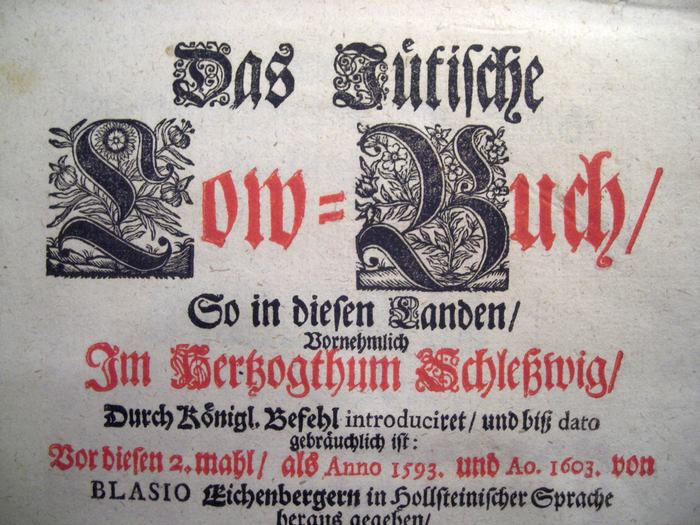 Das Jütische Low-Buch/ So in diesem Landen/ Vornehmlich im Herzogthum Schleßwig/ durch Königl. Befehl inntroduciret und biß dato gebräuchlich ist... von Blasio Eichenbergern in Hollsteinischer Sprache heraus gegeben/ Anitzo aber zum Dritten mahl wiederumb in selbiger Sprache .... Sampt einem vermehrt- und verbesserten Repertorio oder Register/ Benebst Des Herrn [Joachim] Blütings Glossa oder Erklährung über obgedachtes Low-Buch/ Zum Druck befördert durch E. W. Flensburg, Balthasar Otto Bosseck, 1717. Pergamenteinband der Zeit, montiertes Rückenschildchen, 4°, 12 Bl, 180 S., 106 Bl Register, 6 Bl, 208 S., 280 S., 118 S., 1 Bl, zahlreiche, sehr hübsch gestaltete Bordüren und Kapitale; -einige Seiten etwas angerändert, Einband mit einigen Flecken und Verfärbungen, gutes Exemplar. Neben dem Hauptwerk von Ekenberger sind in diesem Band enthalten: Emanuel Wölffel: Repertorium Alphabeticum, oder Register/ Darinnen nach Ordnung des ABC die Sachen und Wörter/ die im Jütischen Loh-Buche fürkommen/ enthaltend; a.a.O.// Joachim Blüting: Glossa, Oder Gründliche Erklährung/ Des in hiesigen Landen/ absonderlich Im Hertzogthum Schleßwig/ introducirten und gebräuchlichen Low- oder Rechts-Buchs. a.a.O. [erste Druckausgabe]. *Jyske Lov [so im dänischen Original] ist eine Gesetzesordnung von 1241, die unter Waldemar II. in Kraft trat. Das Jütische Recht galt auf der Halbinsel Jütland bis an die Eider, auf angrenzenden Inseln (wie z. B. Rømø) sowie auf den Inseln Fünen, Fehmarn und Helgoland und ist eine der ältesten schriftlich fixierten Rechtsgrundlagen in Dänemark... Im Königreich Dänemark blieb das Jütische Recht bis 1683 gültig. Der dänische König Christian V. ersetzte es durch das Dänische Recht. Im Herzogtum Schleswig hingegen wurde es weiterhin angewendet und blieb teilweise sogar noch bis zur im Deutschen Reich erfolgten Einführung des Bürgerlichen Gesetzbuchs gültig. In gegenwärtiger juristischer Literatur und Rechtsprechung wird davon ausgegangen, dass einzelne Normen des Jütischen Low weiterhin im Geltungsgebiet in Kraft seien. [Wikipedia].