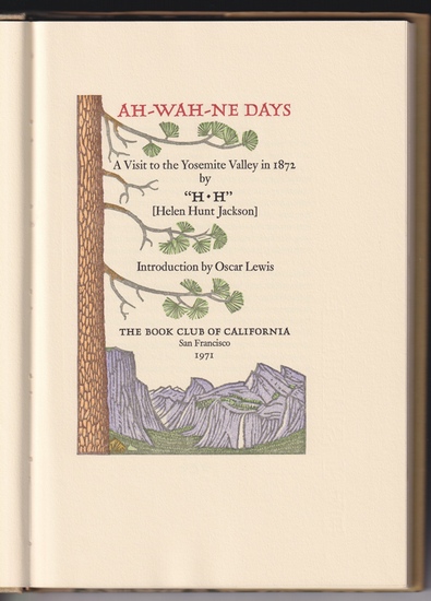 Ah-Wah-Ne Days. A Visit to the Yosemite Valley in 1872. Introduction Oscar Lewis. [Publication no. 137 The Book Club of California]. San Francisco, The Book Club of California, 1971. Half cloth, dj, 4vo, 84 pp., 1 title page illustration, 6 hand-coloured wood-cuts in the text; -dj little sunned, fine copy. 450 copies of this book have been made by Mallette Dean at Kentfield, with Van Dijck monotype composition by Mackenzie& Harris; binding Cardoza-James.