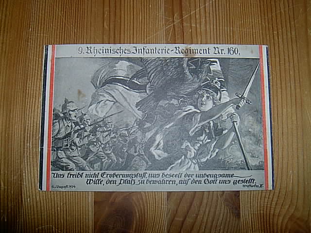 Feldpostkarte / Postkarte / Ansichtskarte: "9. Rheinisches Infanterie-Regiment Nr. 160". Verlag Trau & Schwab, Dresden 1915. gelaufen, mit Feldpoststempel, etwas braunfleckig, (Postkarten, Ansichtskarten, AK, Feldpost, Feldpostkarten, Kriegskarte, Erster / 1. Weltkrieg),.