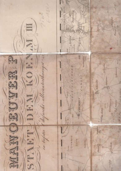 Manoever Plan der Gegend um Berlin. Sr. Majestaet dem Koenige von Preussen Friedrich Wilhelm III. in tiefster Ehrfurcht allerunterthänigst zugeeignet vom Capitain v. Falckenstein im Kaiser Franz Grenadier Regiment. Karte in 2 Teilen. Schrift von W. Jaeck. Gestochen von H. Brose. (vermutlich vor 1840 ?). 2 Landkarten; auf Leinen aufgezogen; jeweils ca. 48 x 50 cm. Karten stw. randfleckig; Leinenhintergrund tls schmutzig; Kartenteile tls. lose (aber komplett). - Manöver-Karte um 1840 (oder früher ?) // Zwei Karten - Karte 1 zeigt die Gegend im Westen / Nordwesten von Berlin mit Charlottenburg, "Spandow" (Spandau), Ketzin, Nauen, Cremmen, Oranienburg, Wustermark, Dallgow, Gatow, Schmachtenhagen; Groß Zieten, Hohen Neuendorf, Birkenwerder usw. / Karte 2 zeigt die Gegend im Osten / Nordosten von Berlin mit Mahlsdorf, Altlandsberg, Strausberg; Zinndorf, Werneuchen, Steinbeck, Dannenberg, Gersdorf, Biesenthal, Bernau, Rüdenitz, Sternebeck; Herzfelde, Ruhlsdorf, Hirschfelde, Zepernick, Schwanebeck, Schönwalde, Wartenberg, Ahrensfelde, Schöneiche, Eggersdorf, Petershagen, Hennickendorf; Wandlitz, Zehlendorf, Stolzenhagen; Garzin u.s.w. // Plan vermutlich von Eduard Ernst Friedrich Hannibal Vogel von Fal(c)kenstein (* 5. Januar 1797 in Breslau; ? 6. April 1885 auf Schloss Dolzig im Landkreis Sorau (Lausitz)) - preußischer General der Infanterie. ... Vogel von Falckenstein besuchte das Gymnasium seiner Heimatstadt und trat am 14. März 1813 als freiwilliger Jäger in das 1. Westpreußische Grenadierbataillon der Preußischen Armee ein. In den Befreiungskriegen gegen Napoleon nahm er 1813/14 an den Kämpfen bei Großgörschen, Bautzen, Laon und an der Katzbach sowie bei Montmirail und Château-Thierry teil. Für seine Leistungen bei Bischofswerda erhielt er das Eiserne Kreuz II. Klasse sowie für Thionville den Russischen Orden des Heiligen Georg V. Klasse. Nachdem er 1841 zum Major befördert worden war, wurde er 1848 bei der Märzrevolution in Berlin während eines Straßenkampfes verwundet. Anschließend kämpfte er in Holstein, wurde am 24. August 1848 Kommandeur des Garde-Schützen-Bataillons und im Mai 1850 zum Generalstabschef des III. Armee-Korps ernannt. 1851 wurde er zum Oberst befördert, 1855 zum Generalmajor Kommandeur der 2. Garde-Infanterie-Brigade. Von 1856 bis 1858 war er Direktor des Militärökonomie-Departments. Im Jahr 1858 wurde er Generalleutnant und übernahm erst die 5. Division, dann die 2. Garde-Division. Vogel von Falckenstein war im Deutsch-Dänischen Krieg seit Dezember 1863 Chef des Generalstabs der verbündeten österreichisch-ungarischen und preußischen Truppen sowie Kommandierender General eines preußischen Armeekorps unter Generalfeldmarschall Friedrich von Wrangel. Am 22. April 1864 wurde Vogel von Falckenstein mit dem Orden Pour le Mérite ausgezeichnet und am 30. April zum Gouverneur von Jütland ernannt. Zwischen 21. November 1864 und 29. Oktober 1866 erhielt er das Generalkommando über das VII. Armee-Korps, 1865 wurde er zum General der Infanterie befördert. ? (wiki).
