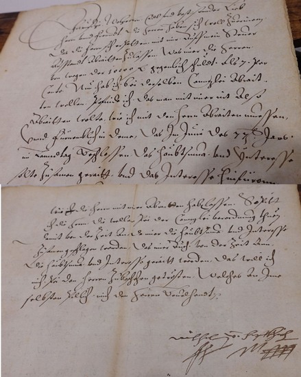 Wilhelm von Hofkirchen (1529-1684), österreichischer Feldmarschall und Hofkriegsrats-Präsident: Eigenhändig signierter Brief an die Landschaft (?), Steuerangelegenheiten betreffend; es geht um eine Summe von 10.000 Gulden. O.O. (Vösendorf?) 1579. Deutsche Handschrift auf Papier; eine Notiz des Empfängers datiert 5. März 1579. Zweiseitiges Schreiben (32,8 x 22 cm), eigenhändig signiert. Von einem zweiten Blatt ist noch ein kleines Stück mit einer Notiz des Empfängers vorhanden. -- Zustand: Papier etwas fleckig, mit leichten Randschäden. Wilhelm I. Frei- und Panierherr von Hofkirchen, Herr zu Kollmitz (Kollmünz) und Drösiedl (Dressidel) (* um 1529 in Drösiedl; gest. 1584, vermutlich in Wien oder Schloss Vösendorf) war ein österreichischer Feldmarschall und Hofkriegsrats-Präsident unter den Kaisern Maximilian II. und Rudolf II. und ein Förderer des Protestantismus. -- Leben: Wilhelm von Hofkirchen war der Sohn von Wolfgang von Hofkirchen (gest. 1538) und der Barbara von Traun. Wilhelm von Hofkirchen besuchte die Wiener Landschaftsschule; einer seiner Mitschüler war der spätere kaiserliche Feldoberst und österreichisch-ungarische General Hans Rueber zu Pixendorf (1529-1584). 1564 wurden ihm Haus Drösiedl samt Dorf, Meierhof und Gründen, Lehen des Kaisers und des Stiftes Melk, von seinem Bruder Hanns von Hofkirchen gegen 3000 Rheinische Gulden überschrieben. 1567 wurde er von Abt Urban I. Perntaz (gest. 1587) mit weiteren Rechten des Stiftes Melk belehnt. Hofkirchen war 1559 bis 1562 Verordneter des Herrenstandes, 1565 General Land-Obrist in Niederösterreich und kämpfte 1566 bis 1569 in Ungarn gegen die Türken. Unter Maximilian II. war er Hofkriegsrat und Geheimer Rat und unter Rudolph II. Hofkriegsrats-Präsident. Die Familie Jud zu Hofkirchen stammt ursprünglich aus Hofkirchen bei Reuth in Niederbayern. Wilhelm von Hofkirchen besaß neben Kollmitz und Drösiedl unter anderem die Herrschaften Guttenbrunn, Aigen, Harmannsdorf, Mühlbach sowie die Schlösser Seebarn und (ab 1565) Vösendorf. Mit Graf Ulrich II. von Hardegg (gest. 1604) auf Glatz und im Marchlande als brandenburgischem Lehensträger in Österreich verhandelte er über die Verleihung der durch den Tod seines Schwagers Adam von Pögl (gest. 1575), Freiherrn zu Reifenstein und Araburg, und von Wolfgang II. von Liechtenstein-Nikolsburg (1536-1585) auf Wülfersdorf heimgefallenen brandenburgischen Lehen um Neusiedl an der Zaya. Noch im Jahr seines Todes 1584 kaufte Hofkirchen von der Familie seines verstorbenen Schwagers Freiherrn Andreas von Pögl (1521-1565) Burg Liechtenstein und Burg Mödling; beide Herrschaften wurden aber von Hofkirchens Erben Kaiser Rudolf II. zur Pfandlösung angeboten und 1592 Hans Graf Khevenhüller-Frankenburg zu Aichelberg (1538.1606) überlassen. Hofkirchen und seine Frau Eva wurden in einem Prunkgrab (gestaltet um 1600) in der Pfarrkirche von Aigen beigesetzt. -- Förderer des Protestantismus: Hofkirchen berief Martin Regulus (1525-1577) zu seinem evangelischen Hofprediger in Wien. Nach der Ausweisung der protestantischen Prediger Mag. Josua Opitz (1542-1585), Mag. Johann Tettelbach d. J. (1546, gest. nach 1586), Michael Hugo (gest. nach 1584) und des Präzeptors Mag. Paul Sesser (gest. nach 1596) im Juni 1578 aus der Stadt ließ er im Hof seines Wiener Freihauses in der Seilergasse (Nr. 1089, alte Nr. 1155, später "Göttweiger Hof", heute Spiegelgasse 9 / Ecke Göttweihergasse) heimlich evangelische Gottesdienste abhalten, in denen auch Kinder getauft wurden. Hofkirchen versuchte, den Göllersdorfer Pfarrer Mag. Wilhelm Friedrich Lutz (1551-1597), der diese verbotenen Gottesdienste hielt, als Prediger bei sich in Wien zu behalten. Dies wurde ihm jedoch von Erzherzog Ernst (1553-1595) verwehrt. Als ihm der Erzherzog am 28. September 1578 "mit grossem Zorn" "Ihr[o] M[ajestät] höchste Ungnade" in Aussicht stellte, antwortete Hofkirchen, er "wöll hiermit seinen Dienst aufkhündt haben, dan er Gott dem Allmächtigen mehr Gehorsam schuldig seye, dan den Menschen". Erzherzog Ernst erwiderte, "Alleweil ihm sein Predicant lieber seye, dan die Kayserl. Maj. So mög er nur hinziehen, bis man wieder wird nach ihm schicken". Hofkirchen verließ noch am selben Tage mit seiner Familie die Stadt Wien. Hofkirchen stellte Lutz anschließend als Nachfolger des verbannten Johann (Hanns) Behem (* 1549) zur Versorgung seiner Schlossgemeinde in Vösendorf und der umliegenden Dörfer ein. 1580 standen fünf protestantische Prediger unter Hofkirchens Schutz, darunter Rudolph Michael in Vösendorf und Paul Binder (* 1542) in Puch (Buch) bei Waidhofen an der Thaya. Familie: Wilhelm von Hofkirchen war seit 1553 verheiratet mit Eva Pögl (Begl)[14] (gest. vor 1591), Freiin von Reiffenstein, Tochter von Siebald Pögl (um 1490-1540), Freiherr von Reifenstein, und Cordula von Herberstein zu Neuberg (1500-1543), mit der er 15 Kinder hatte, darunter den protestantischen Ständepolitiker und Statthalter von Niederösterreich Wolfgang von Hofkirchen (1555-1611). (Quelle: wikipedia.).