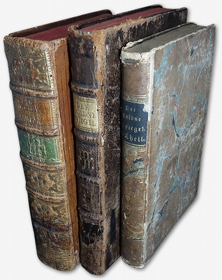 Der Goldne Spiegel, oder die Könige von Scheschian, eine wahre Geschichte. Aus dem Scheschianischen übersetzt. [4 Teile kmpl. in 3 Bde.] Erstausg. Leipzig, bey M.G. Weidmanns Erben und Reich,, 1772. XXIV, 226 S., mit gestochenem Frontispiz u. Titelvignette / 238 S., mit gestochenem Frontispiz u. Titelvignette / XXVI, 228 S., mit gestochenem Frontispiz u. Titelvignette / 232 S., 1 Bl., mit gestochenem Frontispiz u. Titelvignette, Kl.-8°, Drei unterschiedliche Einbände d. Zt. Bloch 2/3393 (mit Schreibfehler im Titel: "goldene"); Goedeke IV/1, 555, 66; Holzmann-Bohatta IV, 3260; Bibliotheca Utopistica Hevesi 622 (ebenfalls mit Schreibfehler im Titel, zur 2. Aufl. 1794). - Seltene anoyme Erstausgabe, deren eigenwilligen Verbindung von politischer Theorie u. poetischer Erfahrungskritik, einer Utopie nahe steht. Der Text ist ganz in der Tradition des antiken philosophisch-didaktischen Staatsromans verfasst. Wieland geht es vor allem darum, aufzuzeigen, wie gefährlich der Einfluss von Mätressen u. Priestern auf die Herrschenden ist. Trotz aller Ironie, die auch sein eigenes Werk betrifft, verlässt er dabei niemals den Boden des aufgeklärten Absolutismus. Der vorliegende Titel war es auch, der die Herzogin Anna Amalie von Sachsen-Weimar auf Wieland aufmerksam machte u. ihn in Folge zur literarischen Erziehung ihrer beiden Söhne nach Weimar berief. Der augenzwinkernde Fürstenspiegel erschien anonym in einer Auflage von 2500 Exemplaren. - Einbände 1.) Leder mit fünf Bünden u. goldgepräg. Rücken. Einband berieben, leicht bestossen u. fleckig; Rücken mit kl. Resten eines Klarlackes; kl. Fraßspuren in den Gelenken; Titel u. nachfogende Seite gestempelt "Institut für Universalgeschichte"; Seiten tlw. leicht braunfleckig u. gebräunt. 2.) Leder mit vier Bünden u. goldgepräg. Rücken. Einband berieben, leicht bestossen u. fleckig; Rücken mit kl. Resten eines Klarlackes; kl. Fraßspuren in den Gelenken; Vorsatz u. Titel wie vorher gehender Bd. gestempelt; Seiten tlw. leicht braunfleckig u. gebräunt. 3.) Pappband mit Rückenschild. Einband berieben, etwas bestossen u. fleckig; Deckel mit sehr kl. Einstoß (der auch auf den nachfolgenden Blättern); Seiten tlw. leicht braunfleckig u. gebräunt, sonst gute Expl.