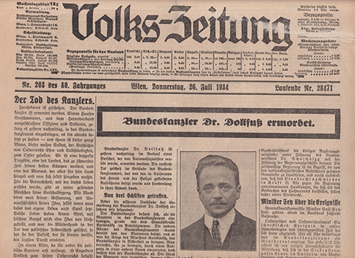 Volks-Zeitung. Wien, Steyrermühl 1934-1939. 80. Jg.: Nr. 203, 206, 84. Jg. Nr. 70, 71, 72, 73, 100, 85. Jg. Folge 322. Mit zahlr. Abb. OHefte, In gutem Zustand. 8 Nummern. 26. Juli 1934 Mit dem Aufmacher: Bundeskanzler Dr. Dollfuß ermordet. 29. Juli 1934: Oesterreich gibt dem Kanzler sein Geleit. 12. März 19389: Radikale Umwälzung in Oesterrich. Regierung Seyß-Inquart gebildet. 13. März 1938: Adolf Hitler in Oesterreich. 14. März 1938: Sontag, 10. April, Volksabstimmung! 15. März 1938: Der Führer spricht zum deutschen Wien. 11. April 1938: Wir sind endlich daheim! 22. November 1939: Münchner Attentäter verhaftet. Georg Elser gestand.