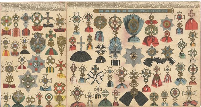Die wichtigsten Orden. Hony soit qui mal y pense. [ca. 1875]. Chromolithographie. 40 x 21 cm. Gefalt. Zeigt 65 Orden, unter anderem: Georgsorden (Bayern), Orden der Rautenkrone (Sachsen), Kronenorden (Preußen), Hohenzollernorden (Preußen) Nordstern (Schweden), Österreich Marianerkreuz, Chrysanthemenorden (Japan).