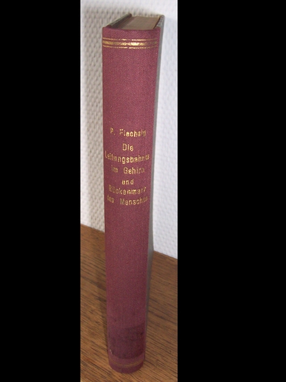 Die Leitungsbahnen im Gehirn und Rückenmark des Menschen auf Grund entwicklungsgeschichtlicher Untersuchungen. Leipzig, Engelmann, 1876. 4°. M. 20 (1 farb.) lith. Taf. XVI, 382 S. Hlwd. m. goldgepr. Rtit. St. verso Tit. u. a. wenigen Textseitenrändern. Gutes u. sauberes Ex. Hirsch II, 536. Waller 3072. NDB V, 226f. Erste Ausgabe. - Paul Flechsig wurde 1847 in Zwickau geboren, promovierte in Leipzig u. leitete später die neu gegründete Universitäts-Irrenanstalt zu Leipzig, 1929 starb er in Leipzig. Er gilt als bedeutender Vertreter der Neuroanatomie. - Hier vorliegend sein berühmtes Werk über die Leitungsbahnen in Gehirn und Rückenmark.