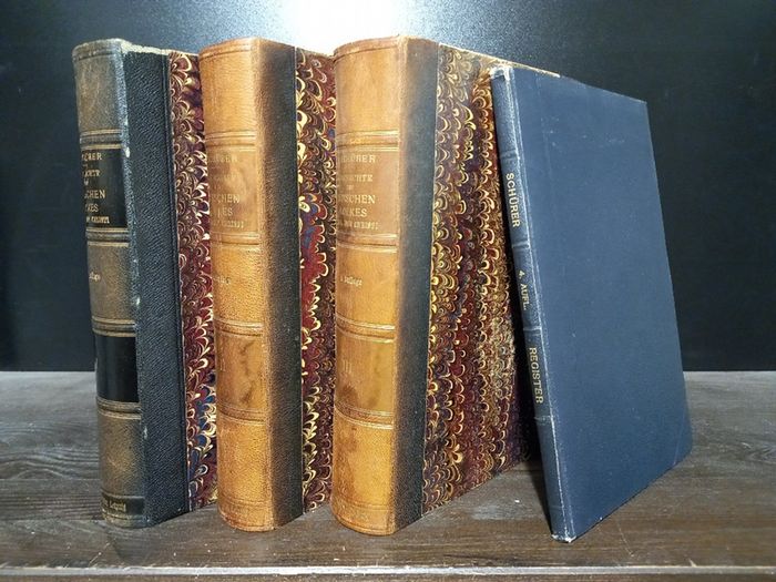 Geschichte des jüdischen Volkes im Zeitalter Jesu Christi. [Von Emil Schürer]. - Band 1: Einleitung und politische Geschichte. - Band 2: Die inneren Zustände. - Band 3: Das Judentum in der Zerstreuung und die jüdische Literatur [und] Registerband. 4 Bände (3 Bände Hauptwerk und Registerband = so vollständig). / Mischauflage. Leipzig: J. C. Hinrichs'sche Buchhandlung 1901-09. VII, (3), 780, (2); VI, (2), 680; VII, 719 Seiten. Gr. 8° (23 x 16 cm). Dekorative Halblederbände der Zeit mit goldgeprägtem Rückentitel, Marmorpapierbezug, Buntpapiervorsätzen und marmorierten Schnitten. [Hardcover / fest gebunden]. Registerband abweichend in Leinen gebunden. - Kapitale und Ecken teils leicht bestoßen, Schnitte gebräunt und leicht angestaubt. Innen unterschiedlich stark gebräunt und gelegentlich ein wenig stockfleckig, sonst jedoch gut erhaltenes Exemplar in dekorativem Halbleder, vollständig mit dem sonst oft fehlenden Registerband.