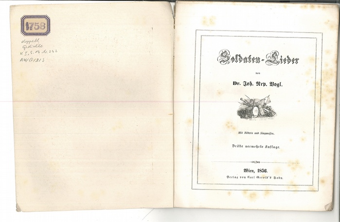 Soldaten-Lieder. Mit Bildern und Singweisen. Wien, Carl Gerold 1856. 3. verm. Aufl. 8°. 60 S., 1 Bll. Mit 9 Holzschn. v. Joseph Hasslwander u. Notenbeispielen. OBrosch. Unaufgeschnitten. Mit figürl. Einbandillustr, tlw. stockfleckig, kl. Eckabriss am Hinterdeckel. Rümann 641 (2. Aufl.) - Enthält 26 Lieder , wie z. B. "Lustig ist Soldatenleben", "Soldaten kümmert's nicht" u. a. Johann Nepomuk Vogl, 1802-1866, war ein österreichischer Schriftsteller, Lyriker und Publizist. Er ist der Wiener Spätromantik zuzuordnen.