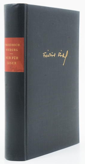 Nur für Leser. Jahre und Bücher. - [Signiert]. - Stuttgart:, Deutsche Verlags-Anstalt, 1955. 420 (1) Seiten, 1 Bl. Verlagsanzeigen, goldgeprägter OLnbd., 21 x 14 cm. Mit eigenhändiger Widmung und Signatur von Sieburg auf dem vorderen fliegenden Vorsatzblatt. Die Widmung richtet sich an den ehemaligen Buchhändler und S. Fischer Vertreter Focke Wortmann. - 7.-11. Tausend. - Minimal berieben und bestoßen; gutes Exemplar.