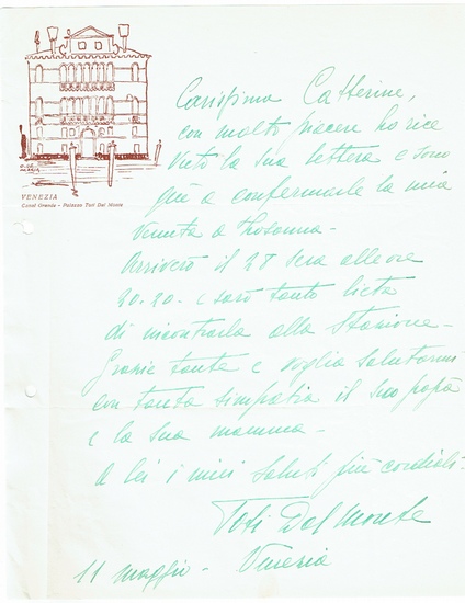 Eigenh. Brief mit Unterschrift. Venedig, 11. März ohne Jahr. 4to. 1 p. mit gedr. Briefkopf ?Venezia | Canal Grande-Palazzo Toti Dal Monte? und einer Graphik eines typischen venezianischen Palastes. Faltspuren. Lochung am linken Rand. An Catherine, der sie ihre Ankunft in Lausanne mitteilt. Dal Monte wollte ursprünglich Klavier studieren, aber nach einer Handverletzung ließ sie sich bei Barbara Marchisio als Sängerin ausbilden. Sie debütierte in einer kleinen Rolle an der Mailänder Scala (1910 als Biancofiore in Francesca da Rimini), zunächst im Fach des lyrischen Soprans. Danach wechselte sie das Fach zum Koloratursopran und studierte bei dem Bariton Antonio Pini-Corsi. 1918 sang sie die Gilda in Rigoletto unter Arturo Toscanini an der Scala, wo sie bald auch Rossini (Rosina im Barbier von Sevilla) und Donizetti-Rollen sang. Daneben sang sie auch viel in Rom und Neapel (La traviata, La Bohème, Madama Butterfly, die sie mit Beniamino Gigli aufnahm). Ab 1924 trat sie auch in Paris (Rigoletto) und ab 1925 in Covent Garden (Barbier von Sevilla, Lucia di Lammermoor) auf. 1924 tourte sie mit Nellie Melba auf deren Einladung in Australien. Im selben Jahr hatte sie ihr Debüt an der Metropolitan Opera. Ebenso sang sie in den 1920er Jahren regelmäßig in Chicago. 1943 zog sie sich von der Opernbühne zurück, nahm aber noch gelegentlich Schallplatten auf und gab Unterricht. Daneben trat sie in verschiedenen Filmen auf, beispielsweise in Anonimo veneziano 1970 von Enrico Maria Salerno (über einen Musiker in La Fenice).