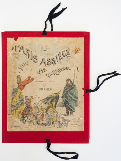 Paris Assiégé Scenes De La Vie Parisienne Pendant Le Siege. - [Mappe mit 31 Litographien]. - Paris:, Au Bureau De L'Eclipse, [1871]. Blattmasse je ca.: 32,5 x 25 cm. Rote Leinenmappe (wahrscheinlich nicht original) mit aufmontiertem lithografierten Titel, mit 31 lithografierten und kolorierten Tafeln und einer lithografierten und kolorierten Titeltafel. Die Blätter von Jules Jean Georges Draner (Anagramm Renard - 1833-1926) sind alle jeweils um unteren Bildrand im Stock signiert. Karikaturen aus dem Leben in Paris während der Belagerung von Paris 1870/71. - Thieme Becker 9, 540. AKL29, 321. - Die stark angeränderten und an den Rändern gebräunten Blätter sind sind überwiegend randfleckig, einige wenige Blätter mit Flecken in der Abbildung. Wenige Blätter haben kleine Lochspuren. Trotz der genannten Mängel bestechen die Zeichnungen vor allem durch die detail- und farbenreichen Kostüme der dargestellten Personen.