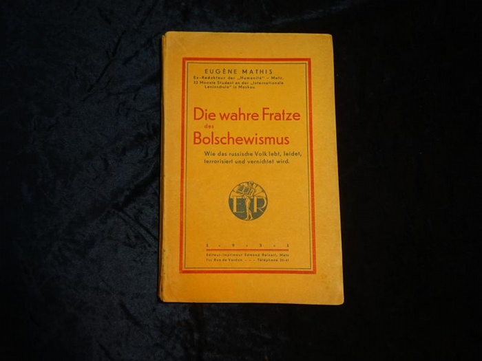 Die wahre Fratze des Bolschewismus : wie das russische Volk lebt, leidet, terrorisiert und vernichtet wird Metz : Reinert - [Saaralben, Lothr.] : 1931. 373 S., OBrosch., gebräunt, etw. schief gelesen. "Der Autor war zum Zeitpunkt der Drucklegung in Metz in Haft. Er bezeichnet sich als Ex-Redakteur der ""Humanité"" in Metz und gibt an, 32 Monate Student an der ""Internat. Leninschule"" in Moskau gewesen zu sein.".