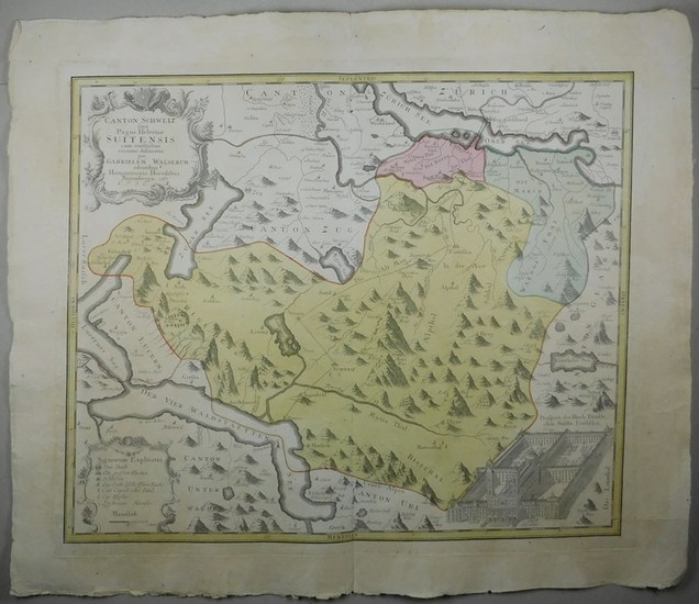 Canton Schweiz sive Pagus Helvetiæ Suitensis cum confinibus recenter delineatus per Gabrielem Walserum. Nürnberg, Homann Erben, 1767. Plattengrösse: 50x59,5 cm. Blattgrösse: 59x69 cm. Grenz- und flächenkolorierte gestochene Karte. Mittelfalz. Sammlung Ryhiner 8608 . - Titelkartusche oben links, Ansicht unten rechts "Prospect des hochfürstlichen Stiffts Einsidlen". - Ränder etwas gebräunt.