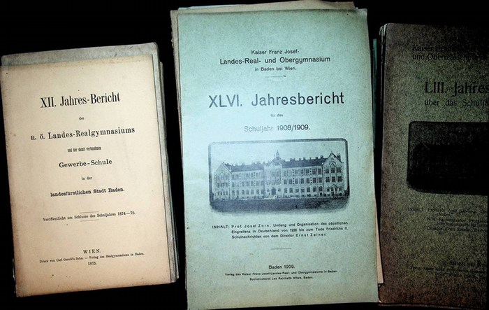 BADEN BEI WIEN- REALGYMNASIUM KONVOLUT VON JAHRESBERICHTEN : 1870-1871 / 1873-1874 / 1874-1875 / 1876-1877 / 1878-1879 / 1879-1880 / 1884-1885 / 1886-1885 / 1888-1889 / 1890-1891 / 1891-1892 / 1892-1893 / 1895-96 / 1899-00 / 1901 /1902 / 1902/1903 / 1903/4 / 1904/1905 / 1905/1906 / 1906/1907 / 1907/1908 / 1908/1909 / 1909/1910 / 1910/1911 / 1911/1912 / 1912/1913 / 1913/1914 / 1914/1915 / 1915/1916 /. Baden bei Wien, Selbstverlag der Schule, 1871-1916. in Broschuren, teils gestempelt; Zustand: gut, Einzeberichte ggf. auf Anfrage. wechselnder Haupttitel: Jahres Bericht des n. ?. Landes-Realgymnasiums und der damit verbundenen Gewerbe-Schule in der landesf?rstl. Stadt Baden Ver?ffentlicht am Schlusse des Schuljahres // Jahresbericht ?ber das n.- ?. Landes-Real- & Ober Gymnasiums in Baden bei Wien f?r das Schuljahr.. / / Kaiser Franz Josef- Landes-Real- und Obergymnasium in Baden bei Wien.