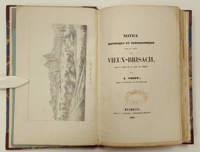 Notice historique et topographique sur la ville de Vieux-Brisach avec le plan de ville en 1692. Mulhouse, Risler, 1860. 339, (5) S., mit 1 Lithographie als Fronitispiz und 1 gefalteten Plan. Neuer Halblederband mit eingebundener Orig.-Broschur. Sehr selten! - Mit einer lithogr. Gesamtansicht von Breisach von Engelmann, Mulhouse, père et fils. Der Plan von "Vieux Brisach en 1692", lithographiert von G. Braun aus Dornach. - A. Coste war Zivilrichter in Schlettstadt. - Der Plan mit kleinem, hinterlegtem Einriss. 2 verschiedene Stempel auf Broschurvorderseite und auf dem Titel. Gutes Exemplar. L.