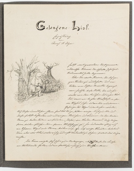 Gelungene List. Erzählung. - [Illustriertes Manuskript eines unbekannten Künstlers und Literaten]. - (um 1900?). Manuskript: (7) Seiten, in losen Lagen, schlichter moderner Kart.-Umschlag, 29 x 23 cm. Manuskript des unbekannten Künstlers und Schriftstellers Josef A. Elger mit 7 sauber ausgeführten Bleistiftzeichnungen. Der Text ist in sauberer Kurrentschrift geschrieben. Motiv der erzählerischen Handlung ist die Begegnung und Freundschaft eines amerikanischen Jägers mit Indianern. - Minimal fleckig; Falzspuren; sonst und insgesamt gutes Exemplar.