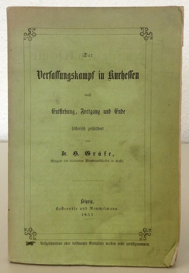 Der Verfassungskampf in Kurhessen, nach Entstehung, Fortgang und Ende historisch geschildert. Leipzig, Costenoble u. Remmelmann, 1851. VIII S., 1 Bl., 298 S. Originalumschlag (verstaubt, Rücken verblaßt). Gräfe (1802-68), verdienter Pädagoge, war damals Mitglied des Ständeausschusses in Kassel u. wurde nach Veröffentlichung des Buches zu einem Jahr Festungshaft verurteilt. Er hatte v. a. den umstrittenen Ministerpräsidenten Hassenpflug u. seine reaktionäre Politik im Verfassungskonflikt heftig kritisiert. - Vgl. NDB VI, 711. - Unbeschnitten. Innen sauber.