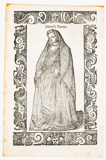 Diverse Donne. - Venedig;, Damiano Zenaro, [um 1590]. Holzschnitt 15,5 x 9,5 cm, Blattgröße 17,5 x 11,5 cm. Der Holzschnitt zeigt eine prachtvoll gekleidete Frau (rückseitig bezeichnet Donne de Venetia), umgeben von Ornamentbändern. - Aus: Christoph Krieger, De gli habiti antichi et moderni di diverse parti del monde .... Das Werk mit zahlreichen Abbildungen zu Kostümen ist in mehreren Auflagen erschienen. - Cesare Vecellio 1521 - 1601, Holzschneider, ab 1570 in Venedig auch als Verleger tätig. - Das Papier minimal fleckig.