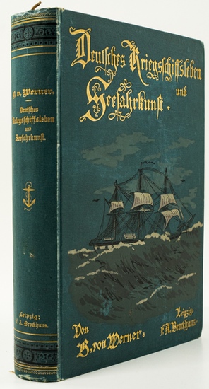 Deutsches Kriegsschiffsleben und Seefahrkunst. - Leipzig:, F.A. Brockhaus, 1891. xviii, 450 Seiten, 16 Tafeln, 2 Kartenblätter, goldgeprägter illustrierter OLnbd., marmorierter Schnitt (Adermarmor), 22,5 x 15 cm. Mit eigenhändiger dreizeiliger datierter Widmung des Verfassers auf dem Vortitel. Die Widmung vom September 1899 richtet sich an den "lieben und verehrten Freunde, Herrn Geheimrath Professor Dr. [Carl] Langenbuch". Langenbuch (1846-1901) war der erste Chirurg, der erfolgreich eine Gallenblase operativ entfernte. - Werner Bartholomäus (1842-1924; ab 1876 von Werner) schloß 1879 als Kommandant der in der Südsee fahrenden deutschen Korvette "Ariadne" einen Freundschaftsvertrag mit Samoa und schuf damit die juristisch-diplomatische Grundlage für die spätere Kolonie Deutsch-Samoa. - Mit Abbildungen auf 16 Tafeln und vier Karten (1 Karte im Text, 3 Karten auf 2 Kartenblättern im Anhang). - Gering berieben und bestoßen; gering verzogen; gutes Exemplar.
